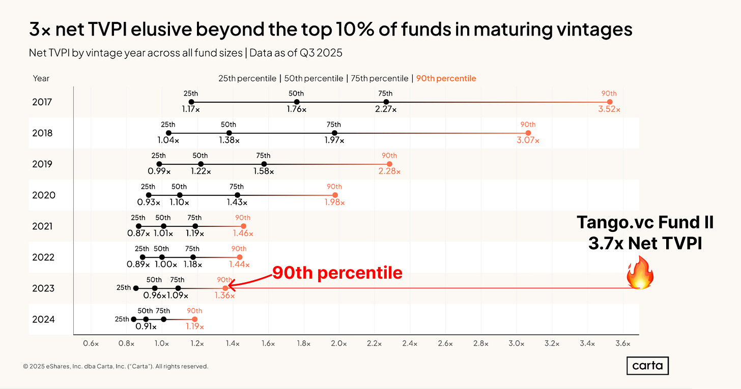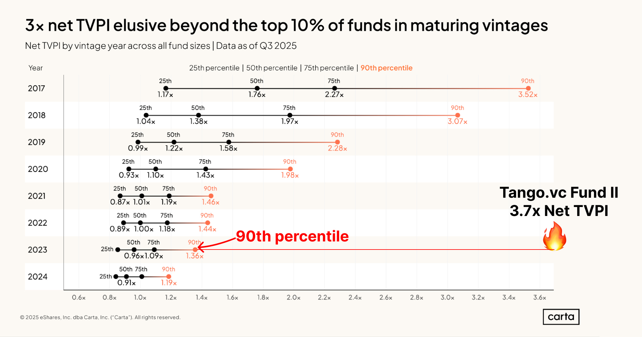 How good is that? Carta is a fund admin that tracks metrics that help compare performance. Usually funds take time to build value, so younger funds have lower multiples. I took their data about net TVPI across vintages and added Tango.vc Fund II which is well above the 90th percentile. It’s literally off the chart, which I enjoyed graphing below.